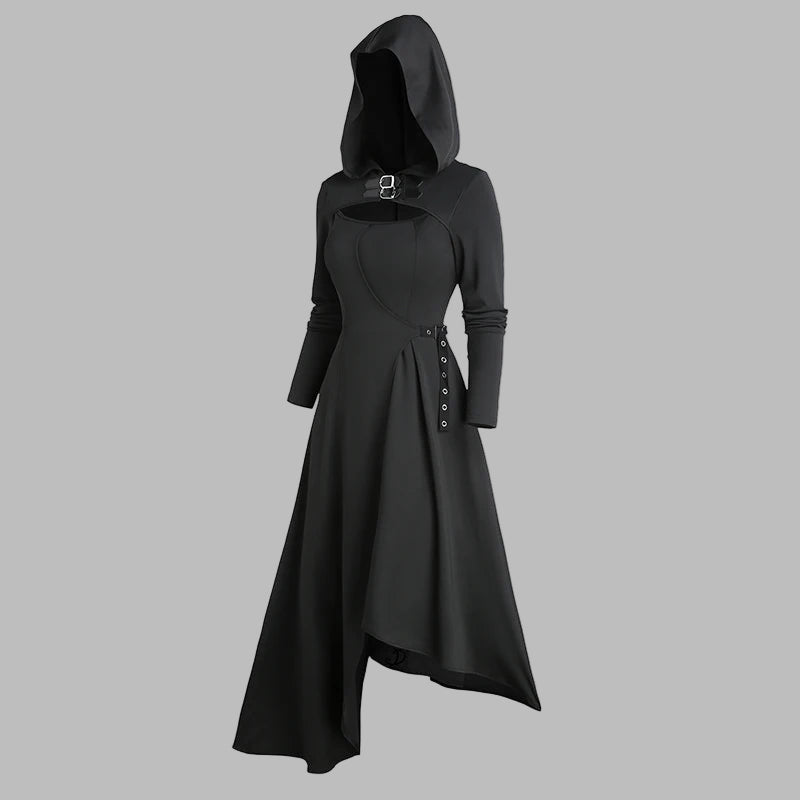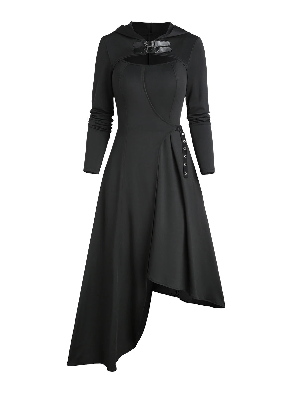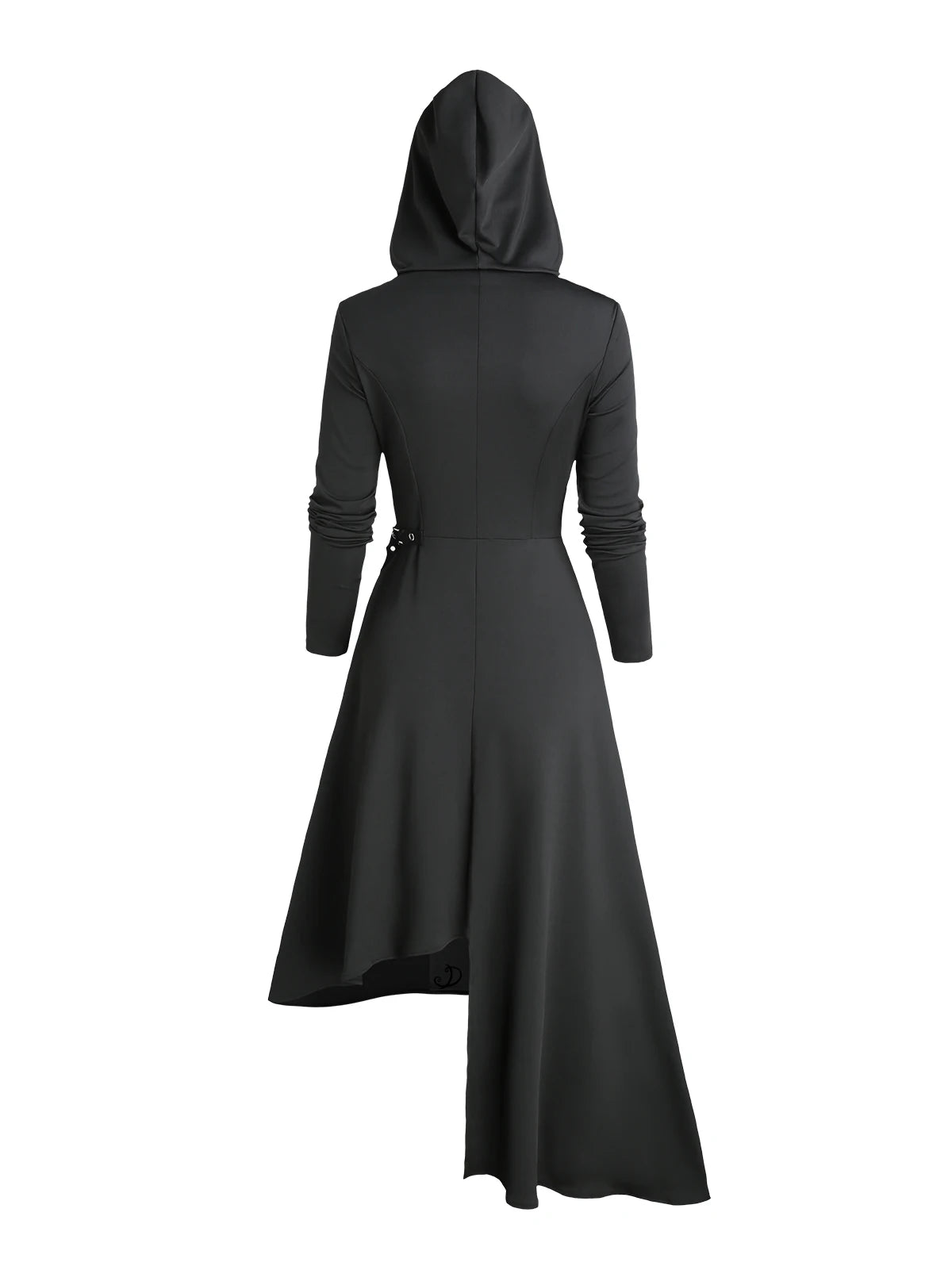 Black Asymmetric Long Hooded Coat with Belt XXL