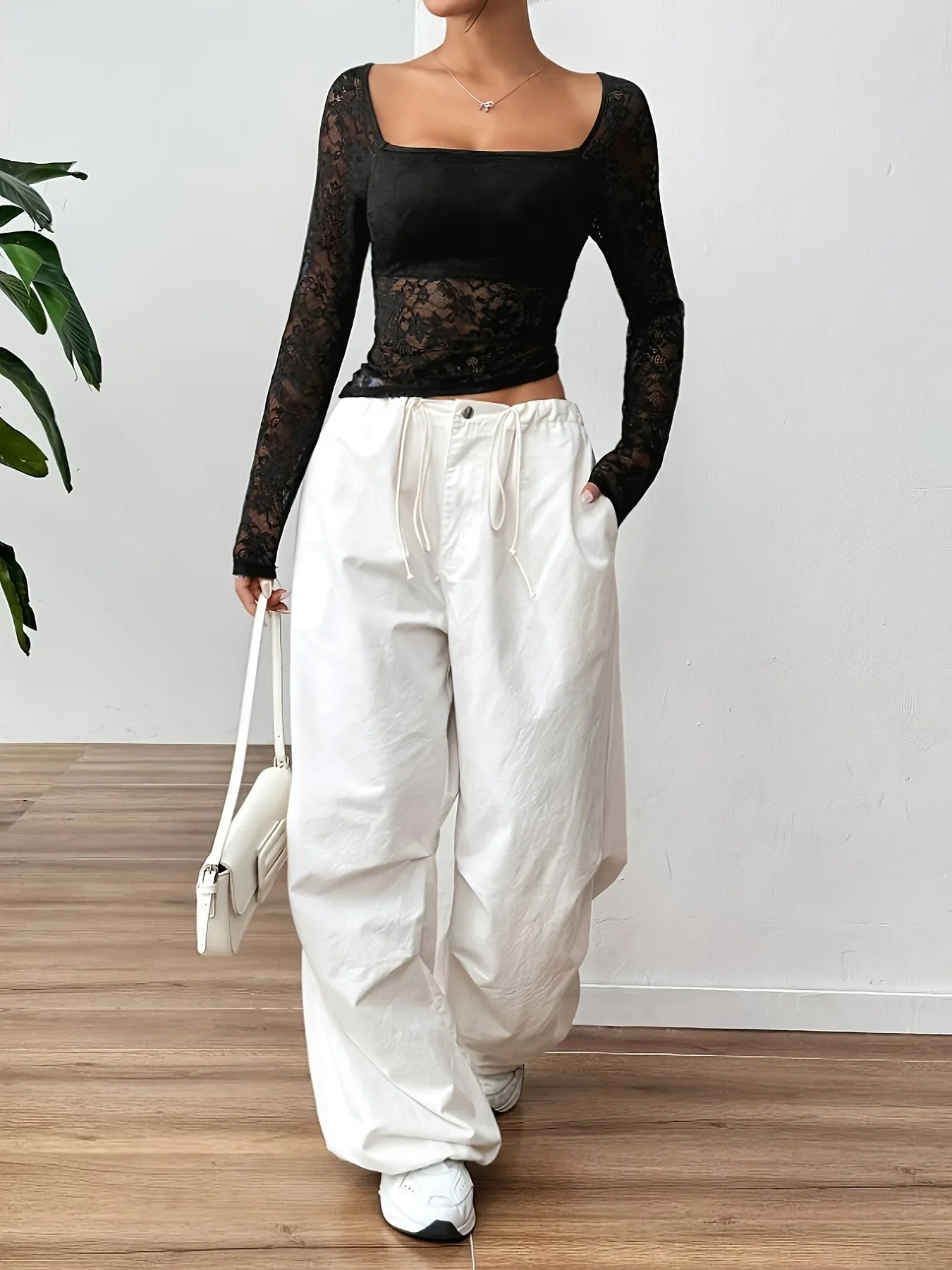 Black Fitted Sheer Lace Long Sleeve Top XL