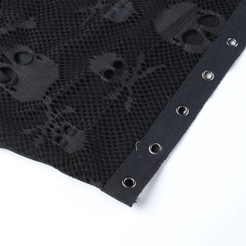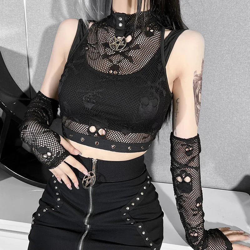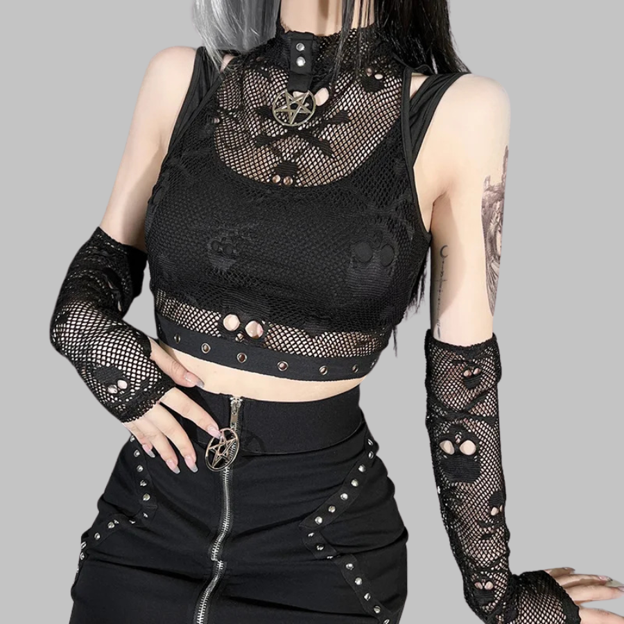 Black Gothic Mesh Top with Skull Print and Fishnet Sleeves