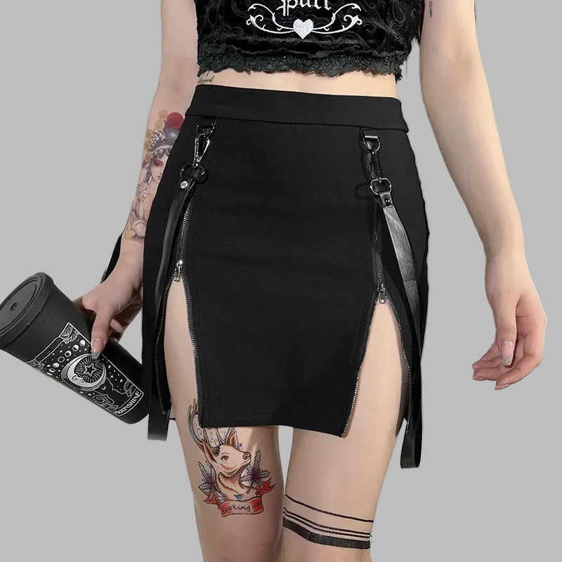 Black Gothic Mini Skirt with Zippers and Strap Belts
