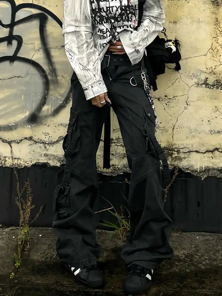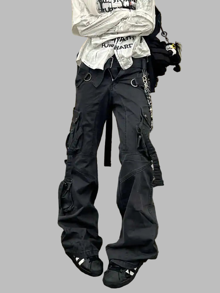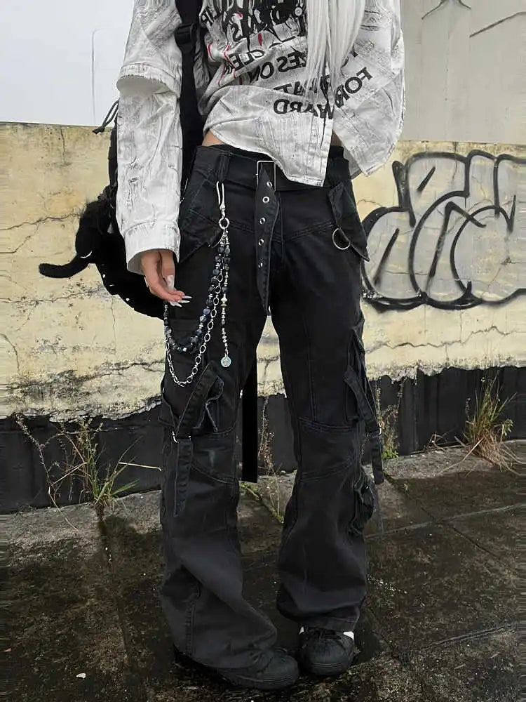 Black Gothic Punk Loose Cargo Pants with Chains and Pockets Unisex