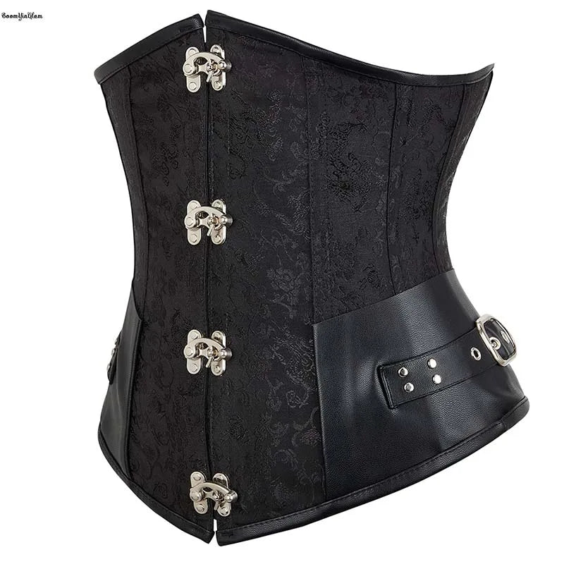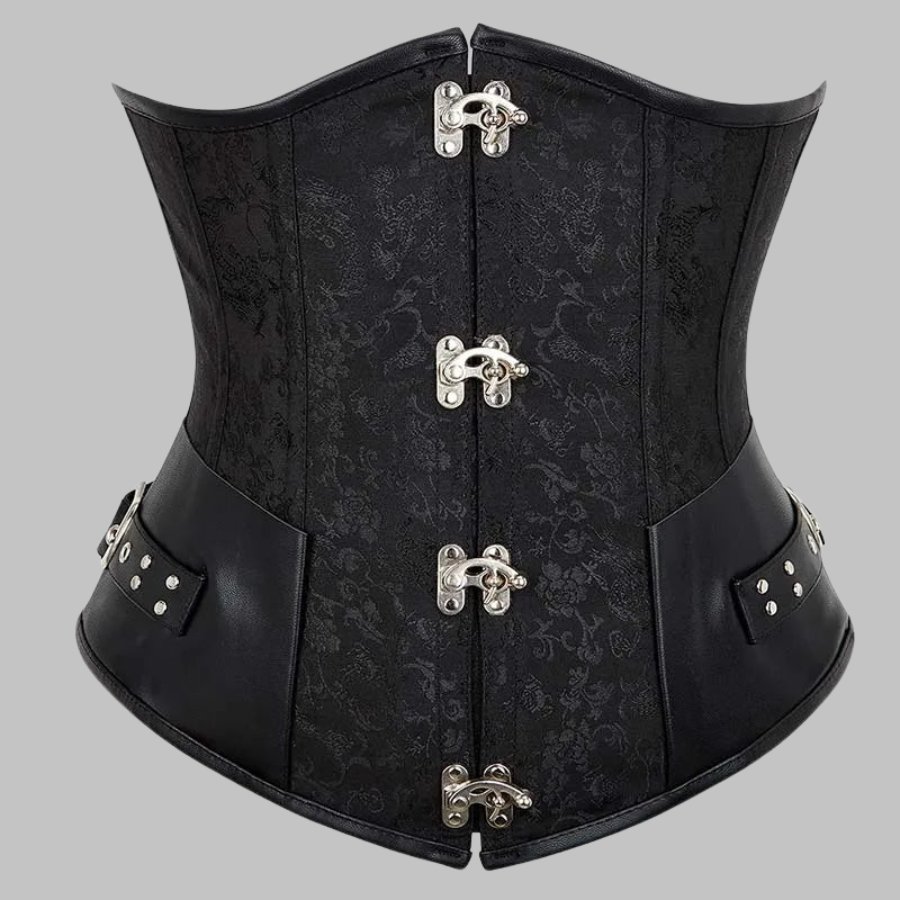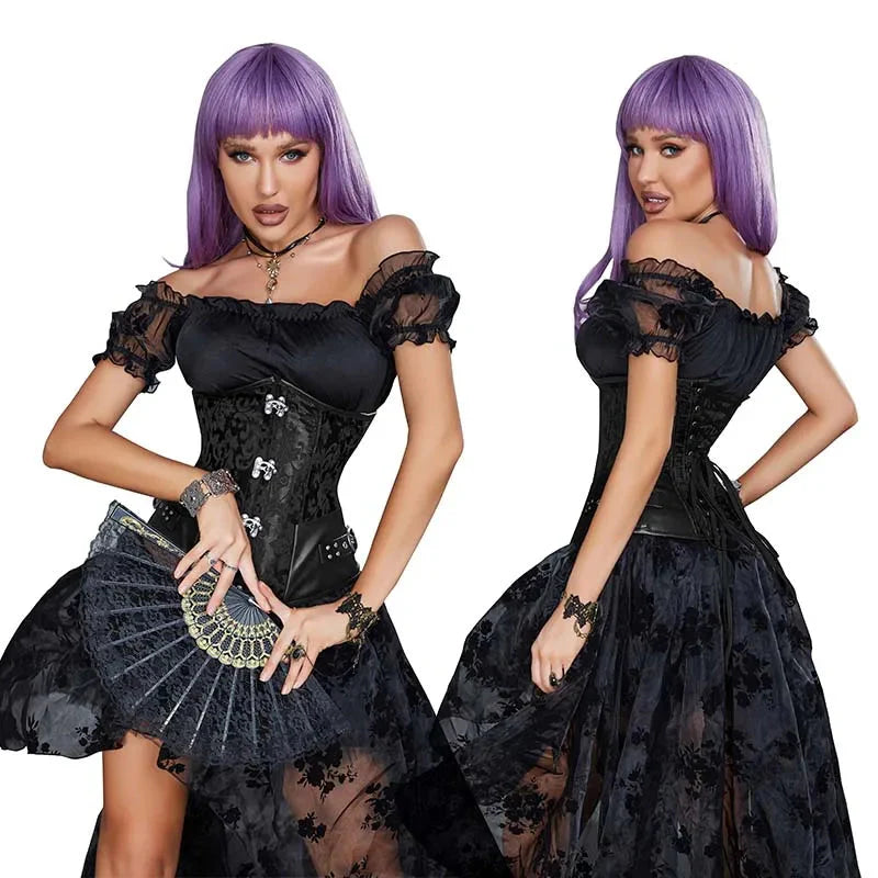 This underbust steampunk corset with a bold design perfectly shapes a silhouette with character. Equipped with 12 steel bones, it provides strong support and a slimming waist effect. Ideal for events, evening outings, cosplay, or as a strong accent in everyday styling. Includes matching color thong.
