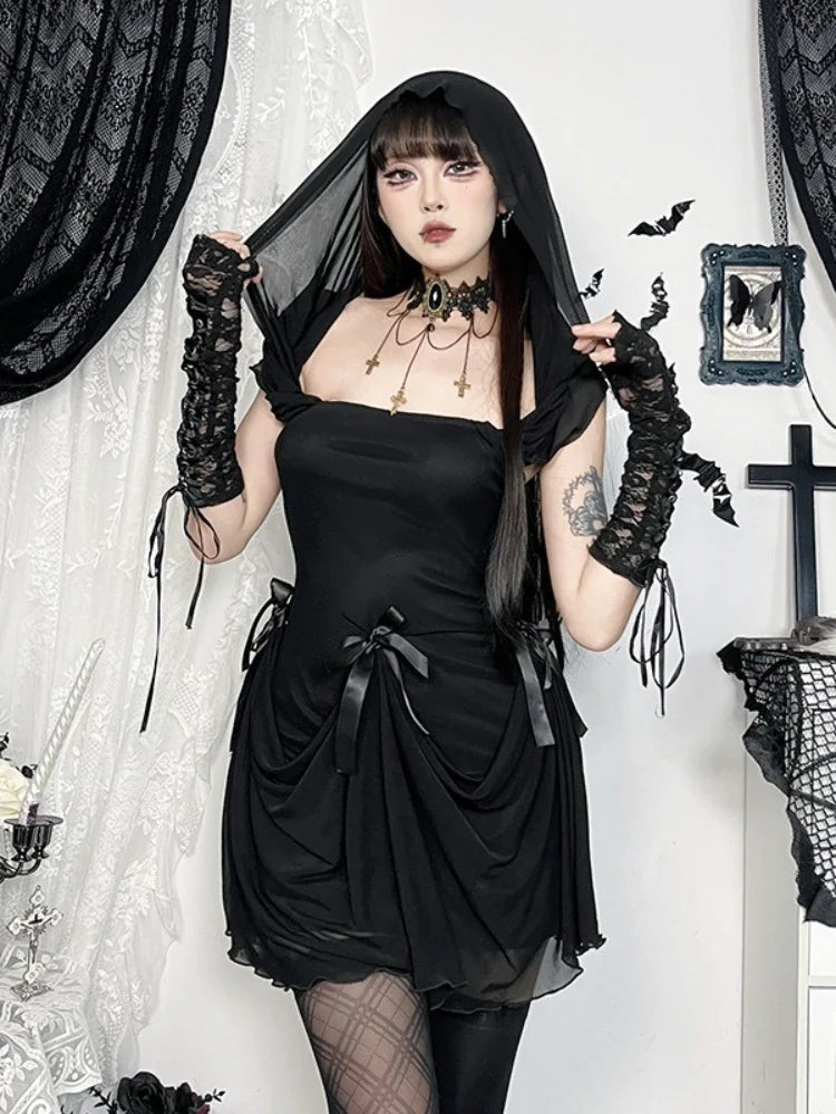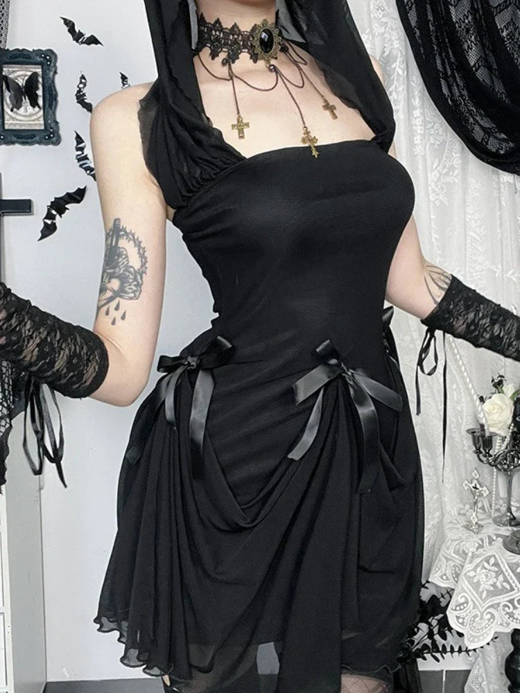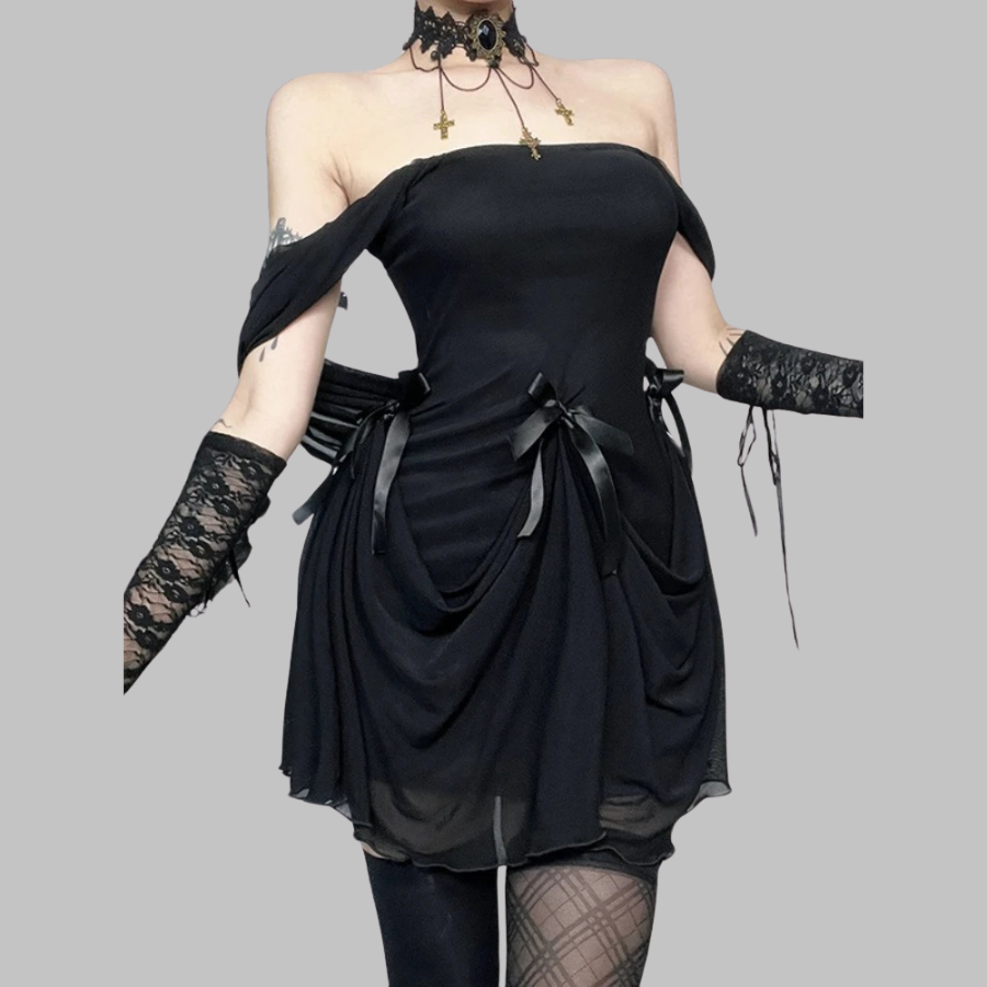 Black Grunge Dress with Long Sleeves and Draped Skirt
