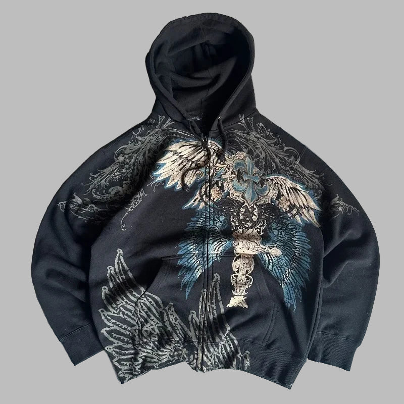 Black Metal Hoodie with Wings and Skulls Print