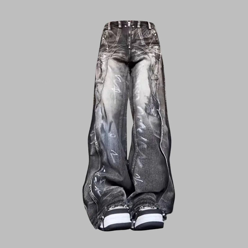 Unisex Black Oversize Wide Grunge Print Jeans