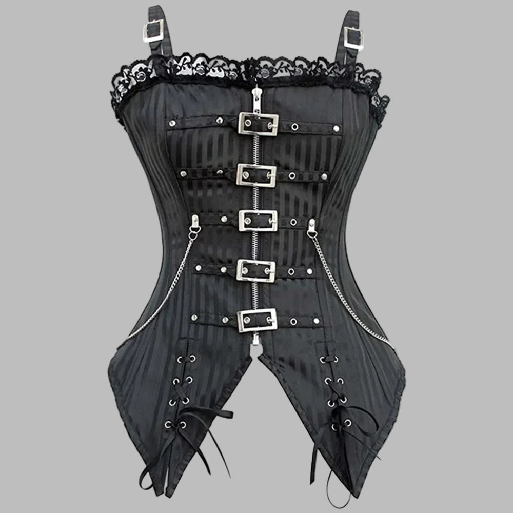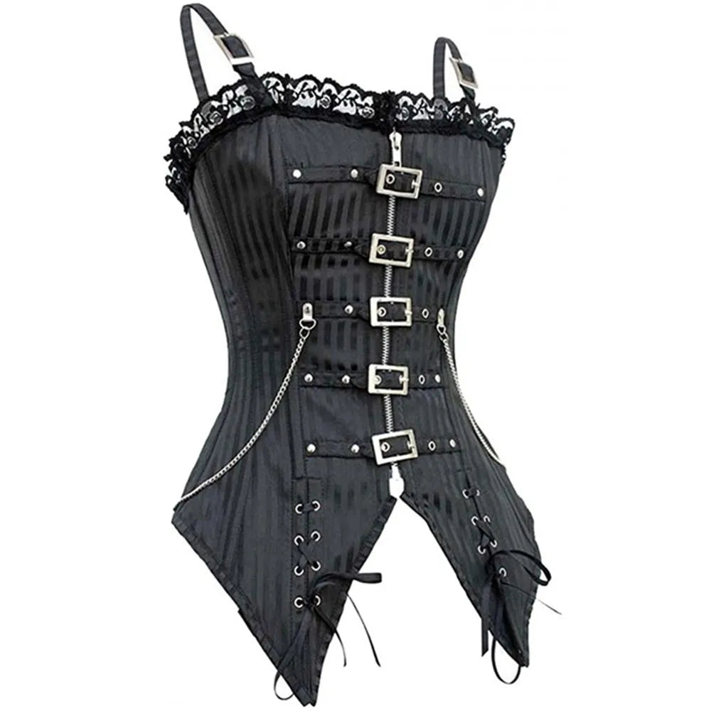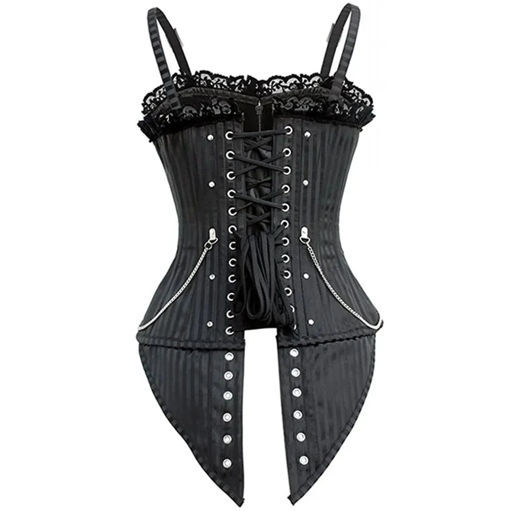 Black Ribbed Punk Gothic Corset with Buckles, Studs, and Chains