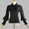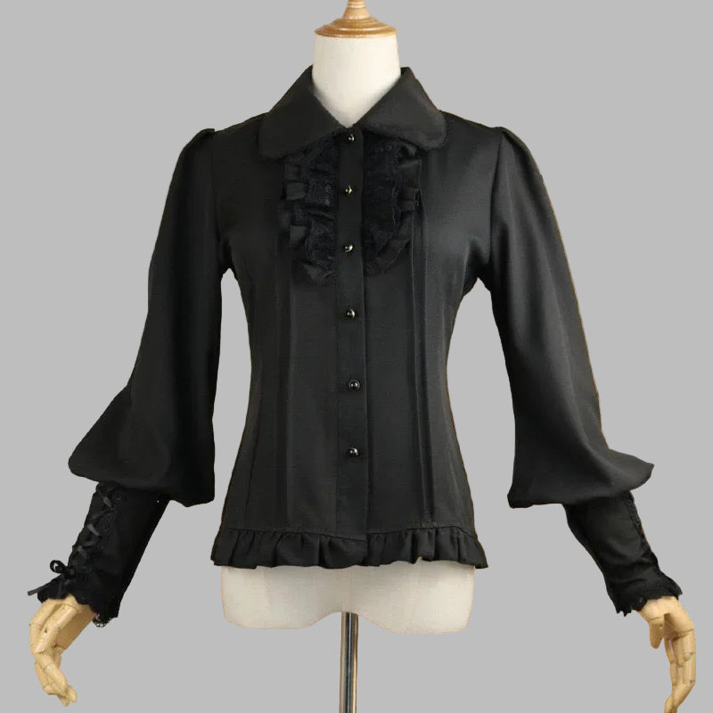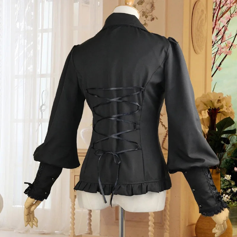 Black Ruffled Blouse with Metal Eyelets and Lace-Up Sleeves