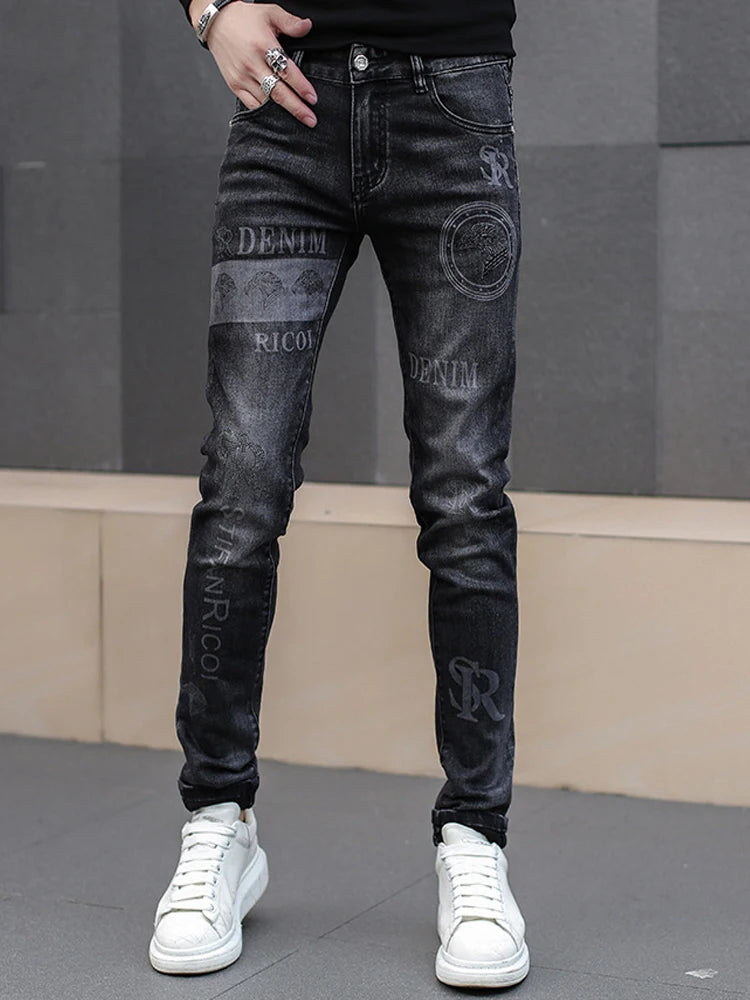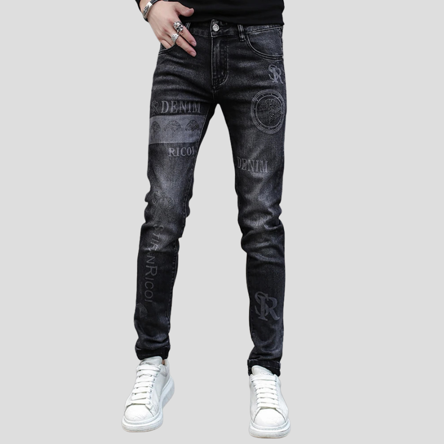 Black Slim Rock Jeans with Writings and Graphic Patterns