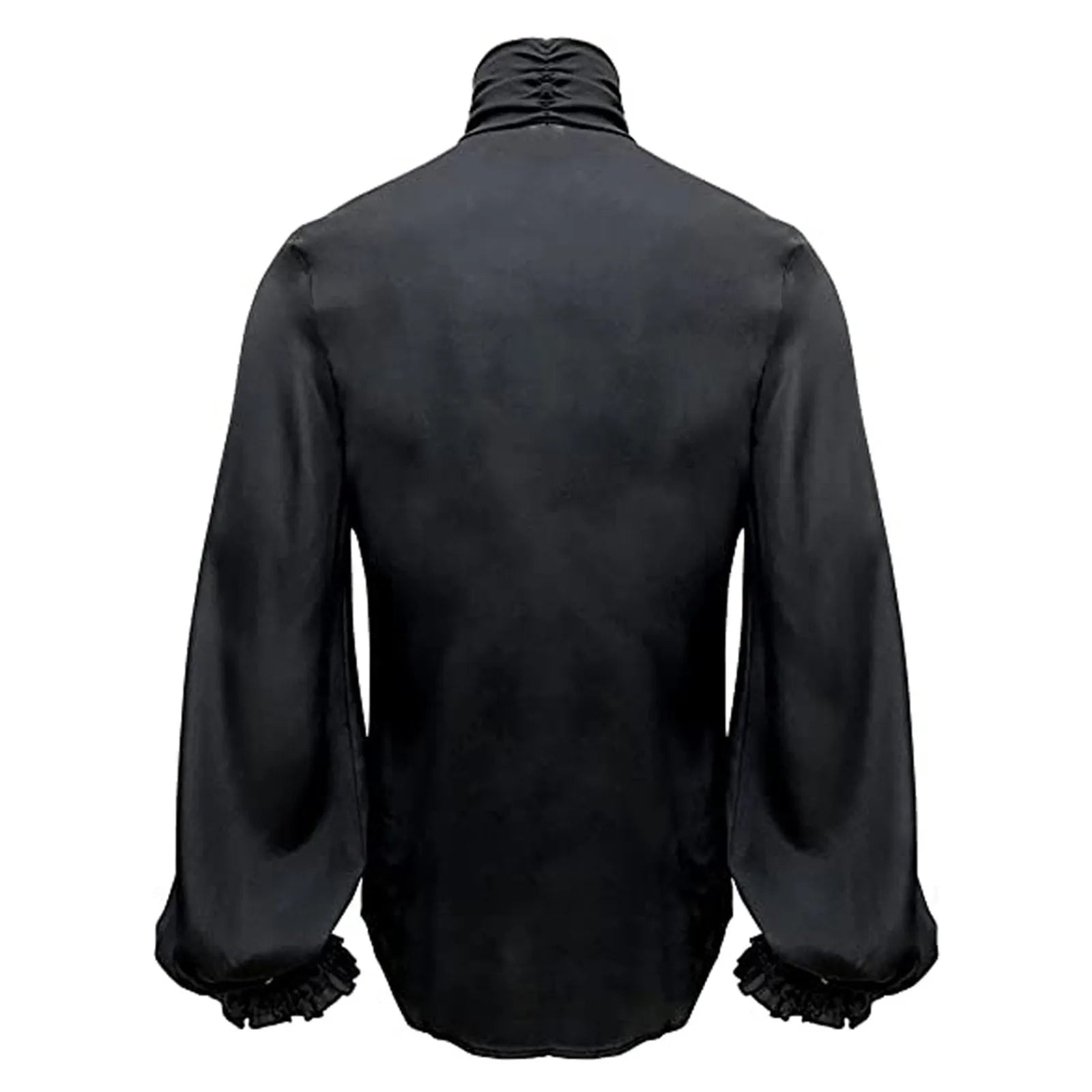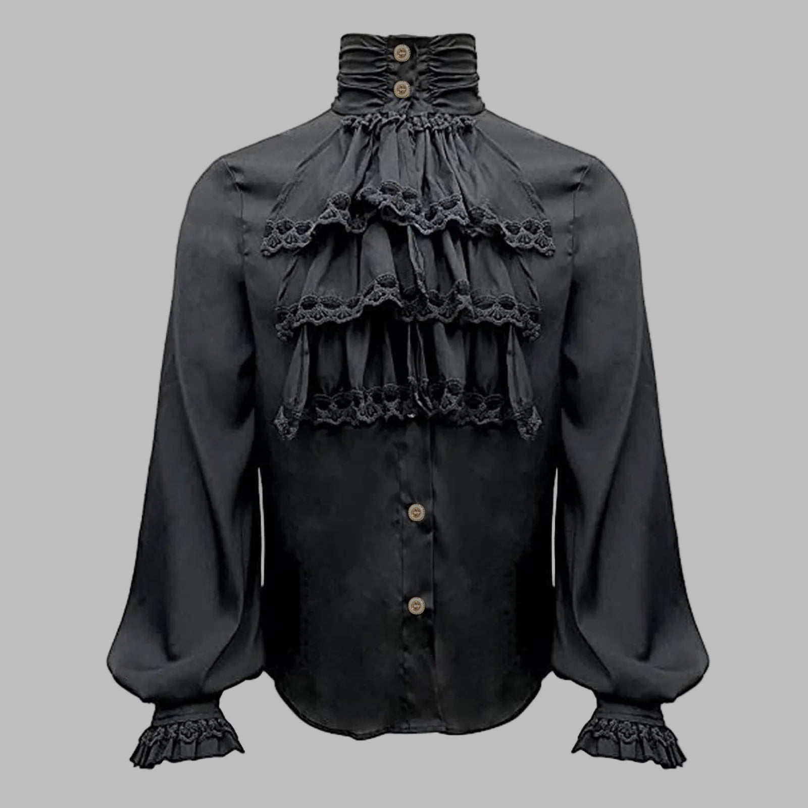 Black Steampunk Shirt with Lace Ruffles and High Collar