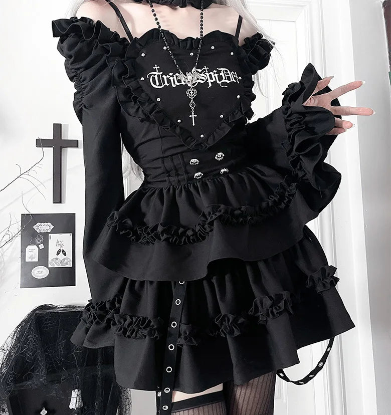 Black Victorian Style Gothic Dress with Ruffles and Long Sleeves