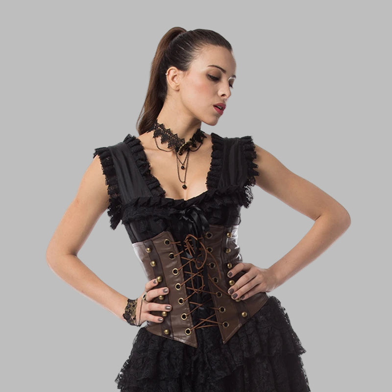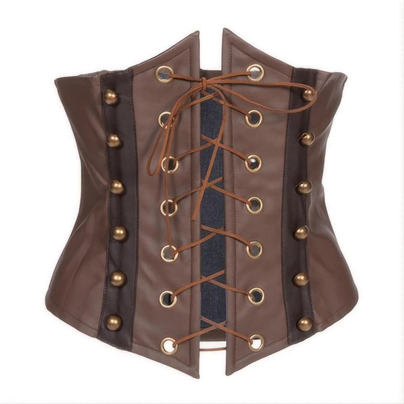 Brown Steampunk Leather Corset with Lace-Up and Buttons