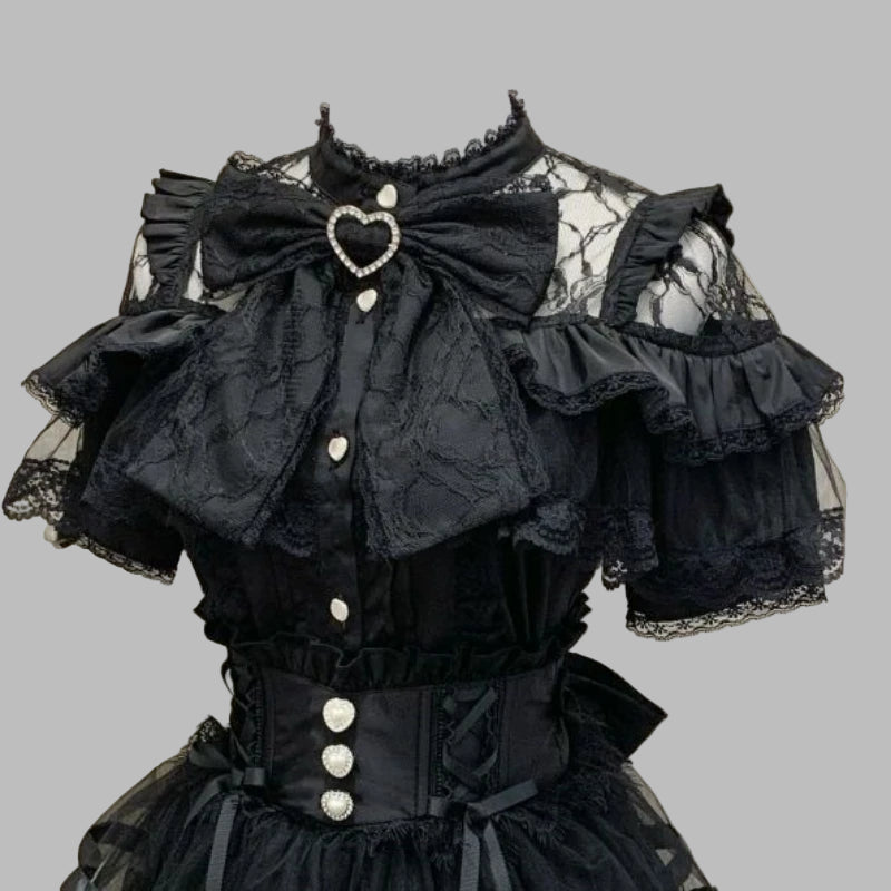 Black Gothic Lace Blouse with Bow and Corset Belt