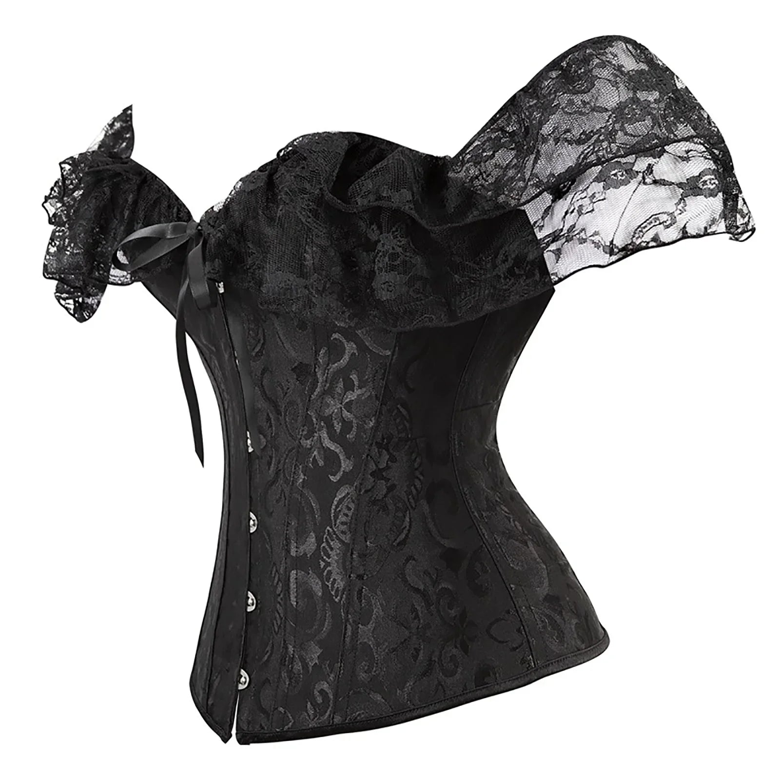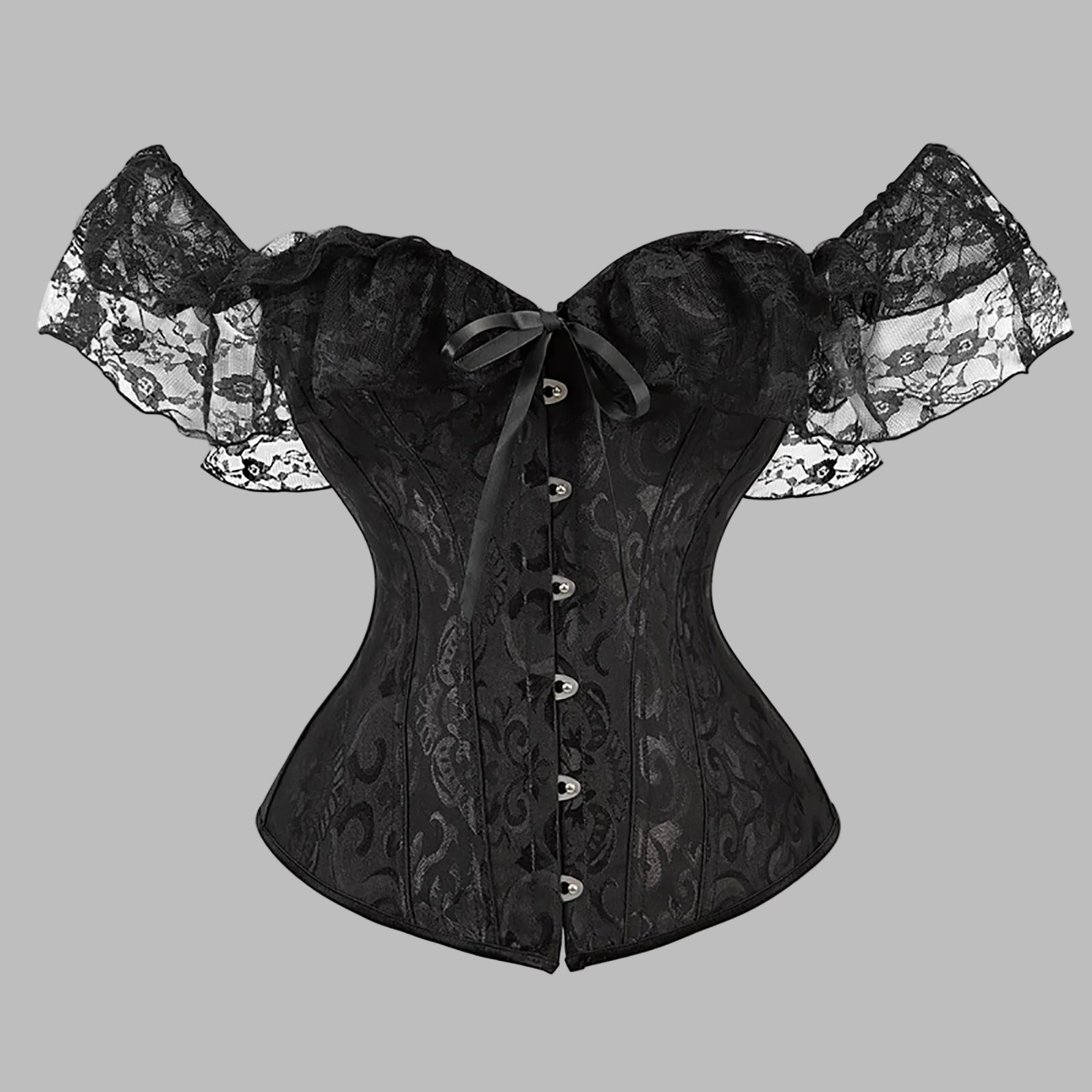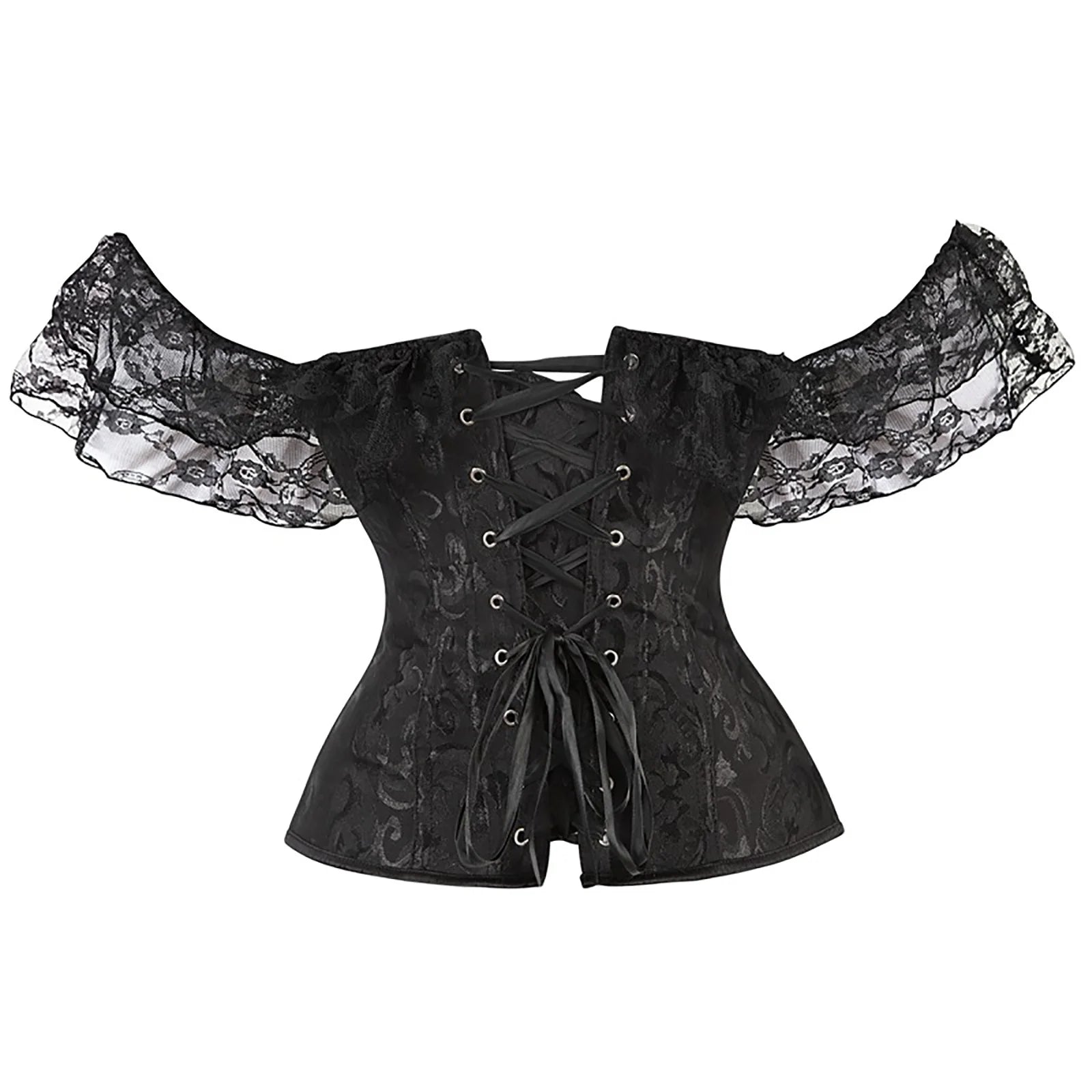 Black Gothic Punk Rock Brocade Corset with Lace Sleeves and Lacing
