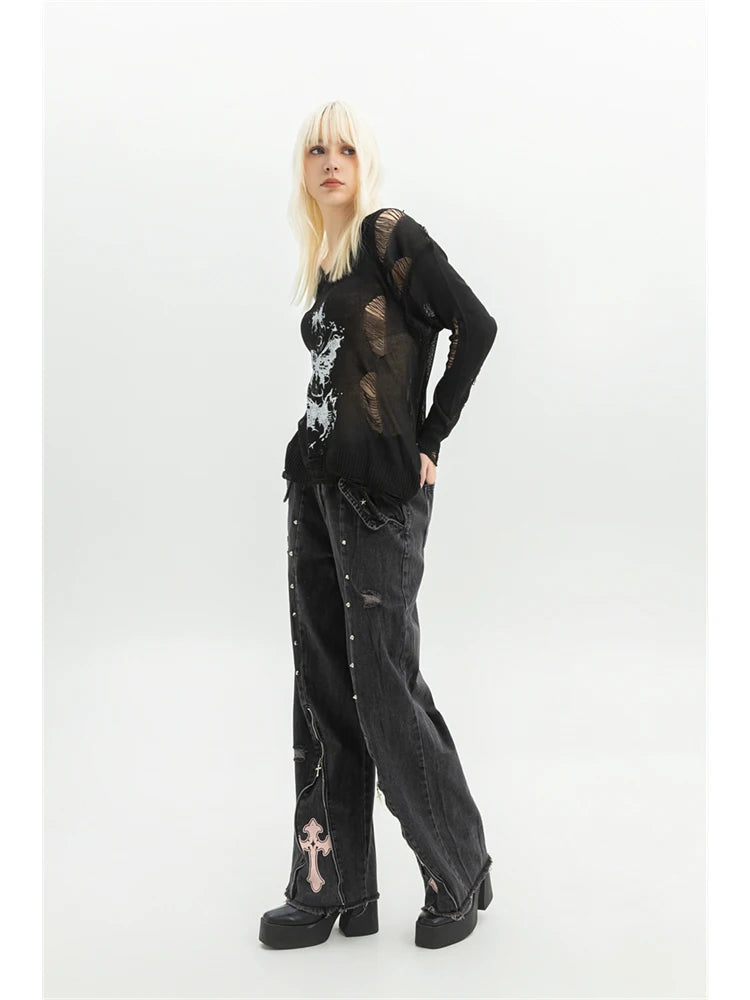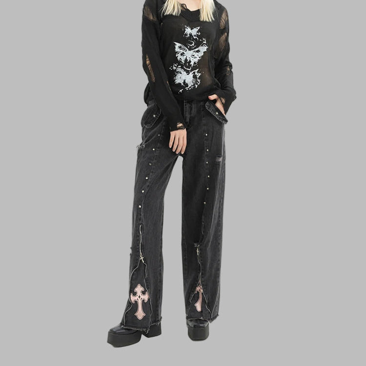 Gothic Punk Wide Denim Pants with Crosses and Studs