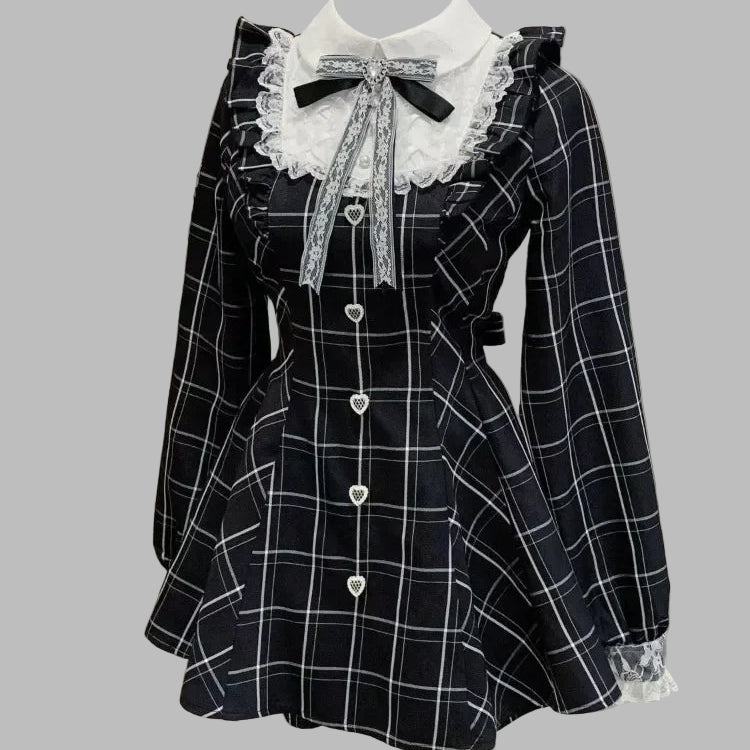 Jirai Kei Black Plaid Dress with Lace Jabot