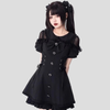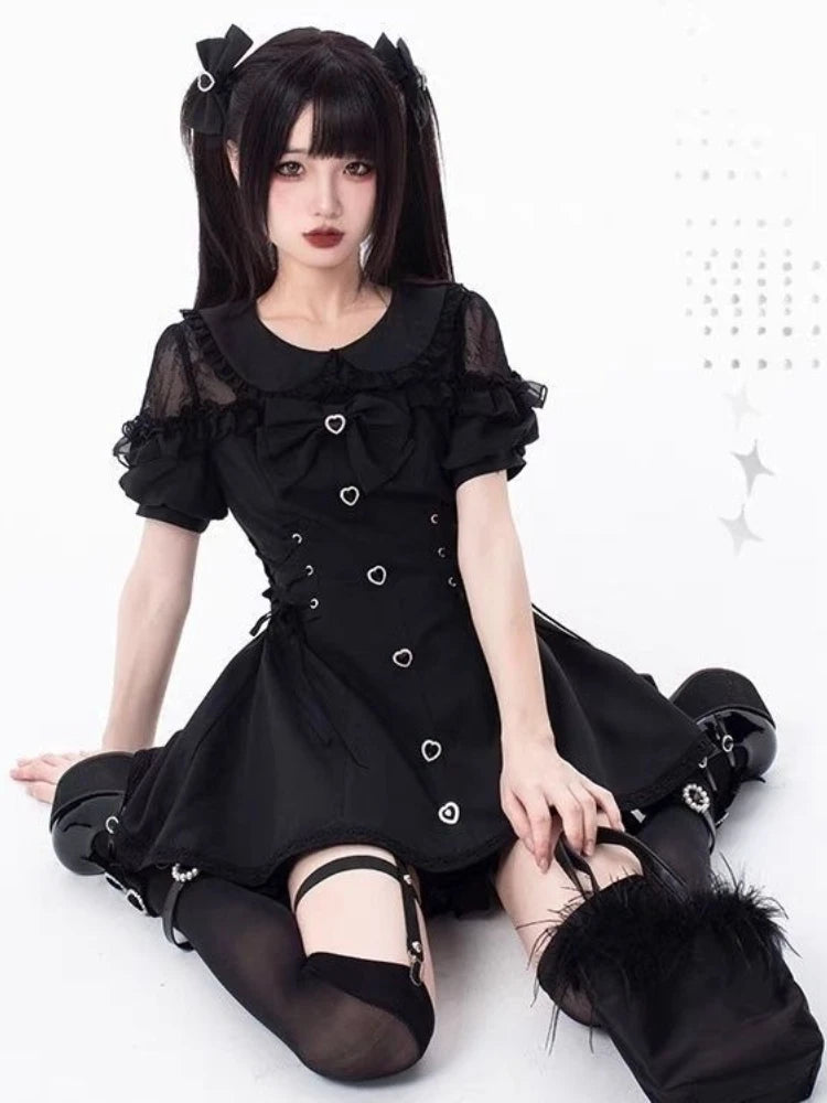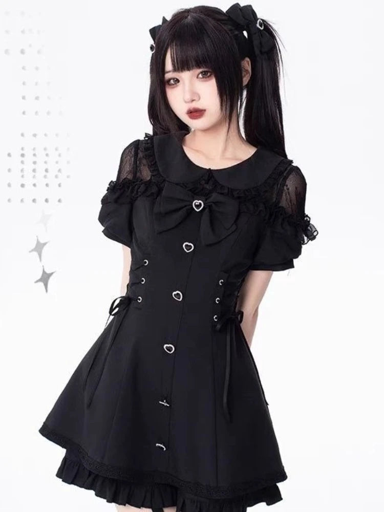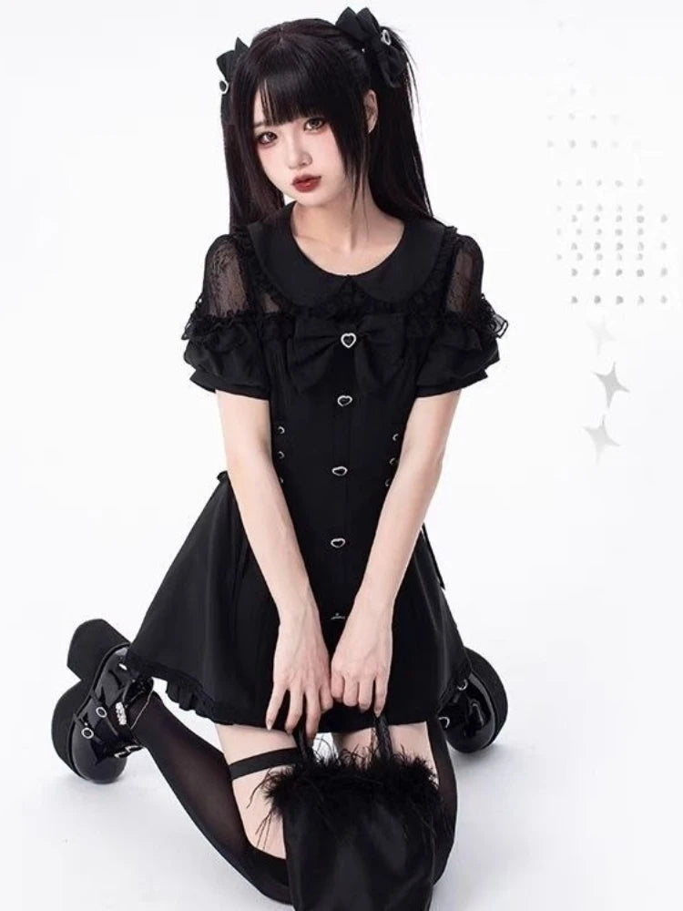 Jirai Kei Black Ruffled Dress with Heart Buttons