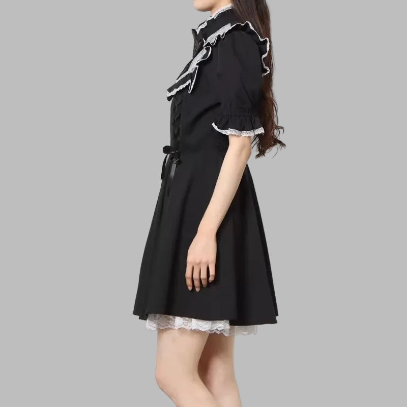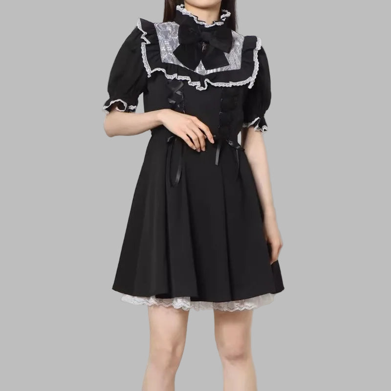 Jirai Kei Dress with Lace Bow and Lacing Black