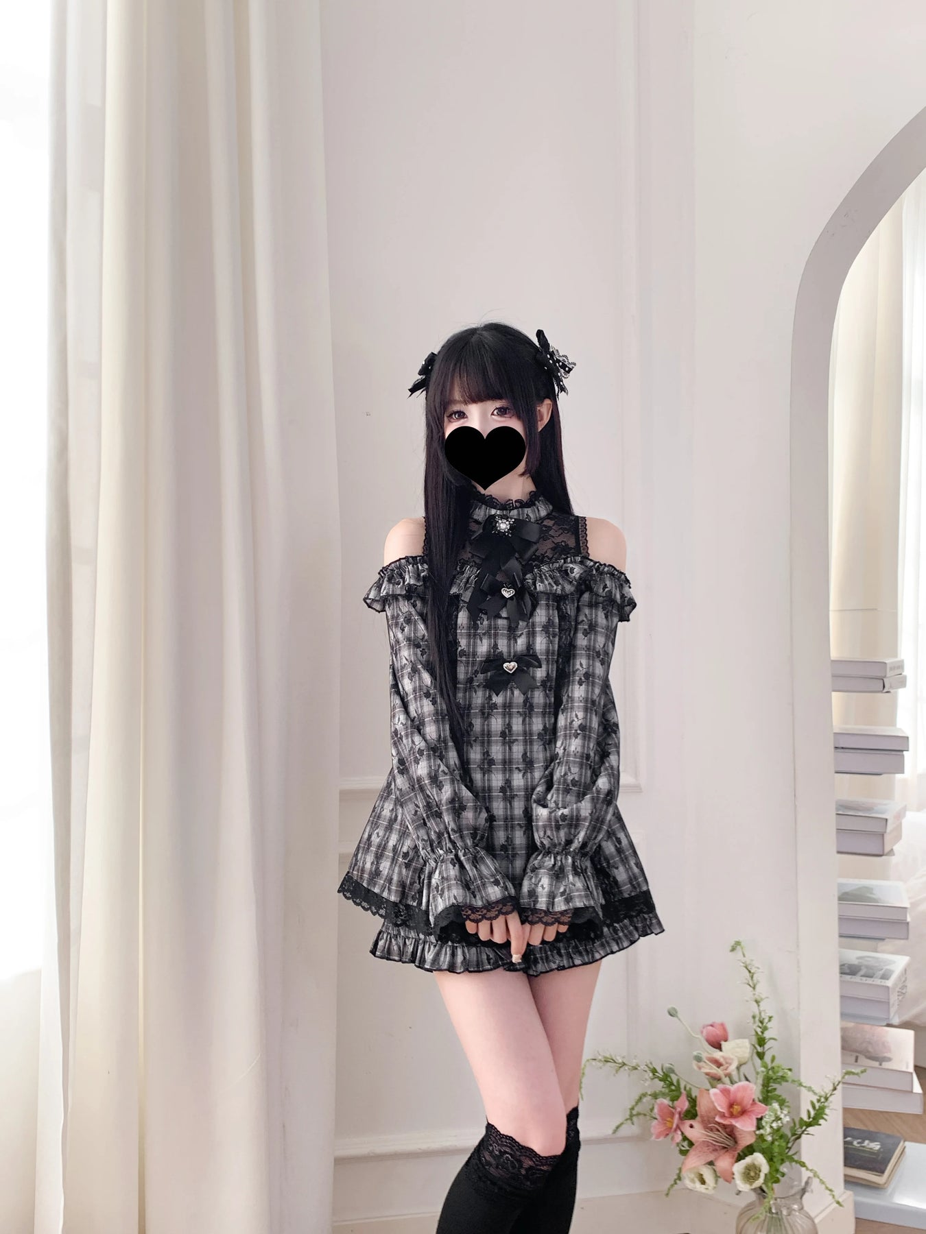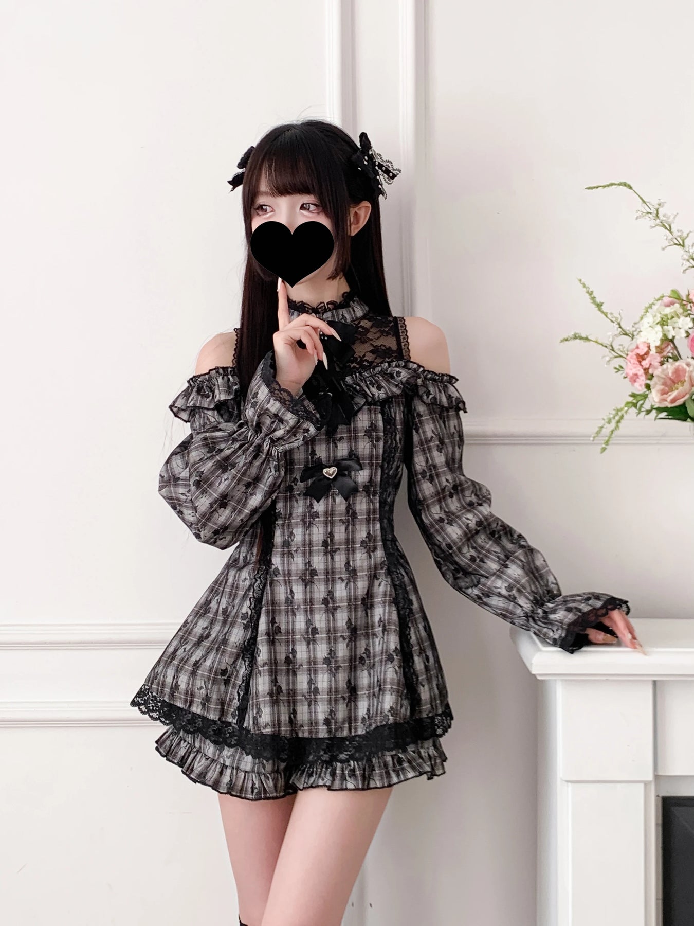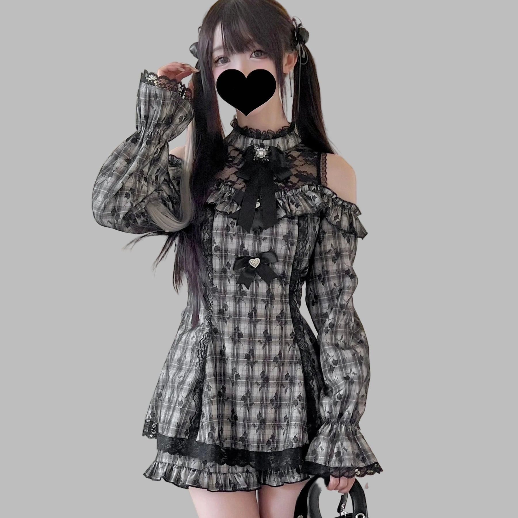 Jirai Kei Gray Plaid Off-Shoulder Dress with Lace