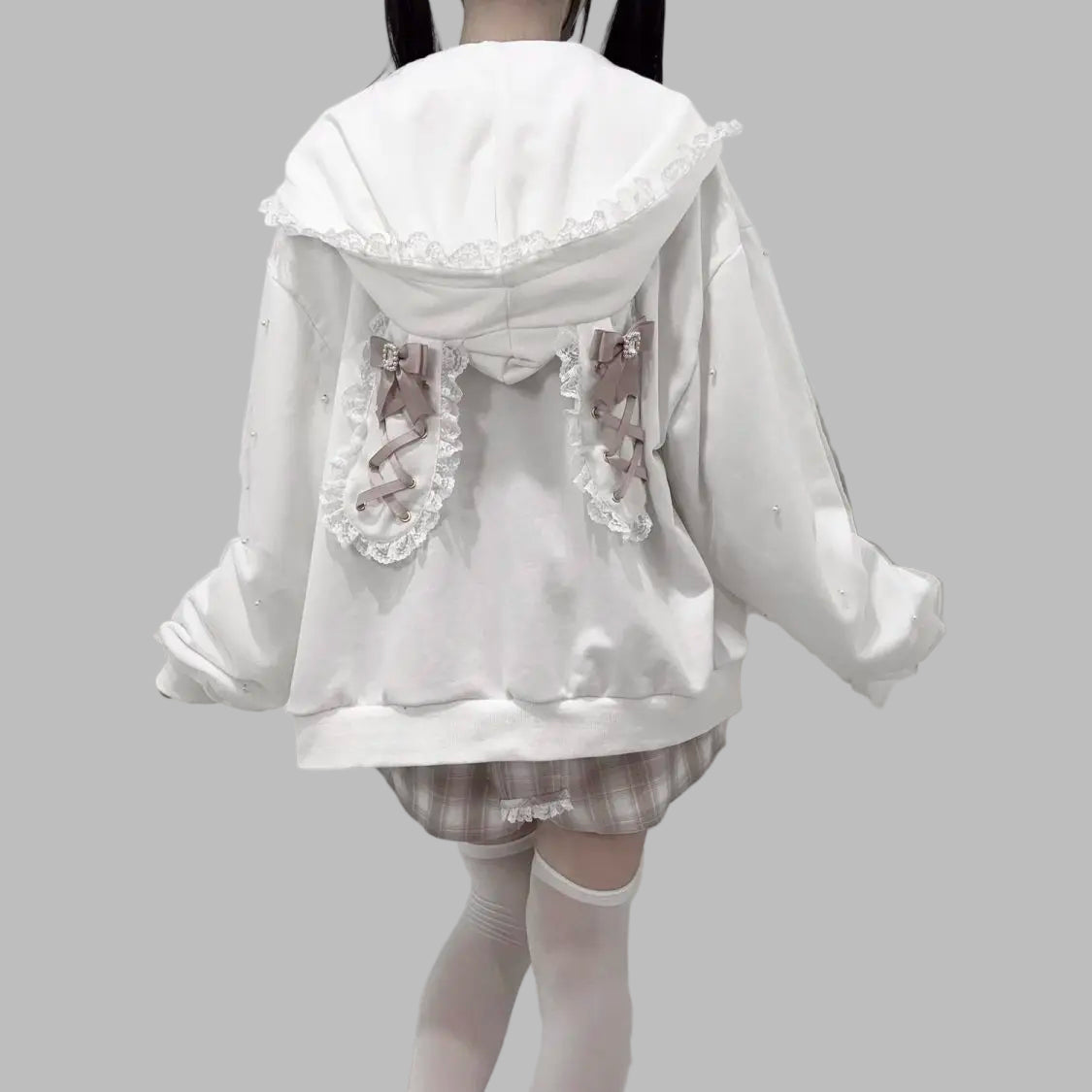 White Jirai Kei Oversized Sweatshirt with Lace Bows