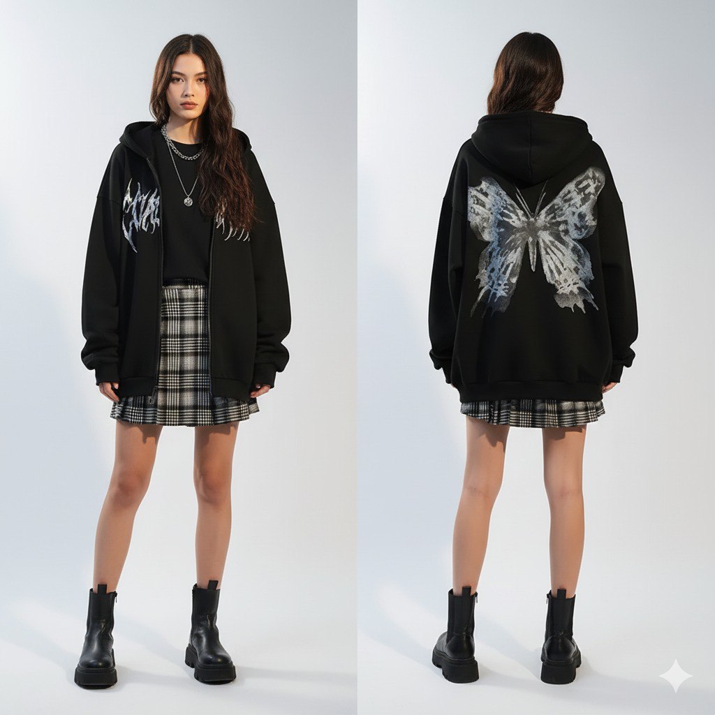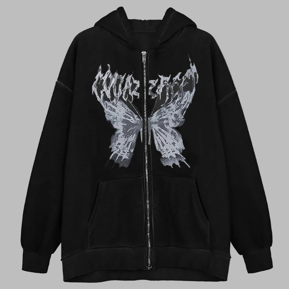 Long Black Punk Rock Hoodie with Butterfly on Back