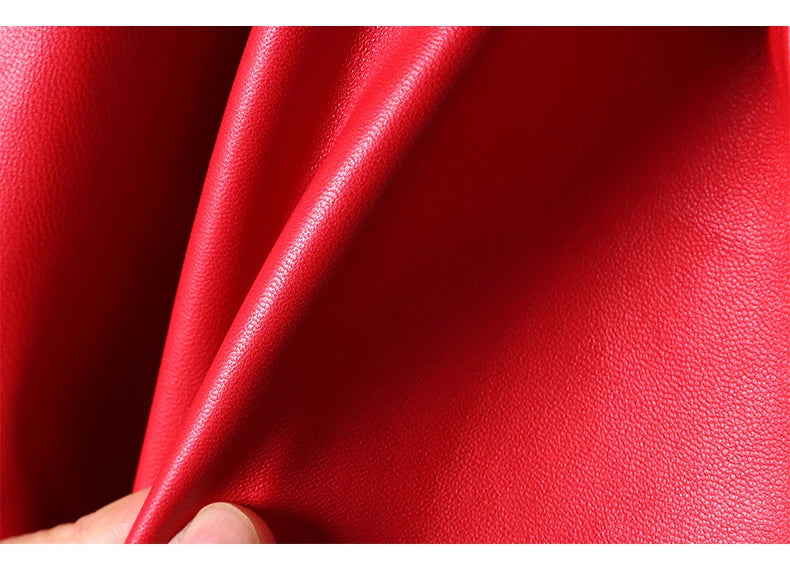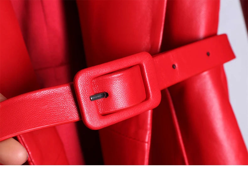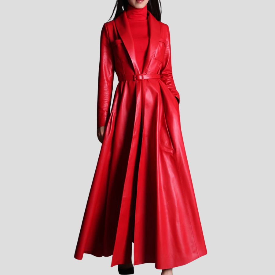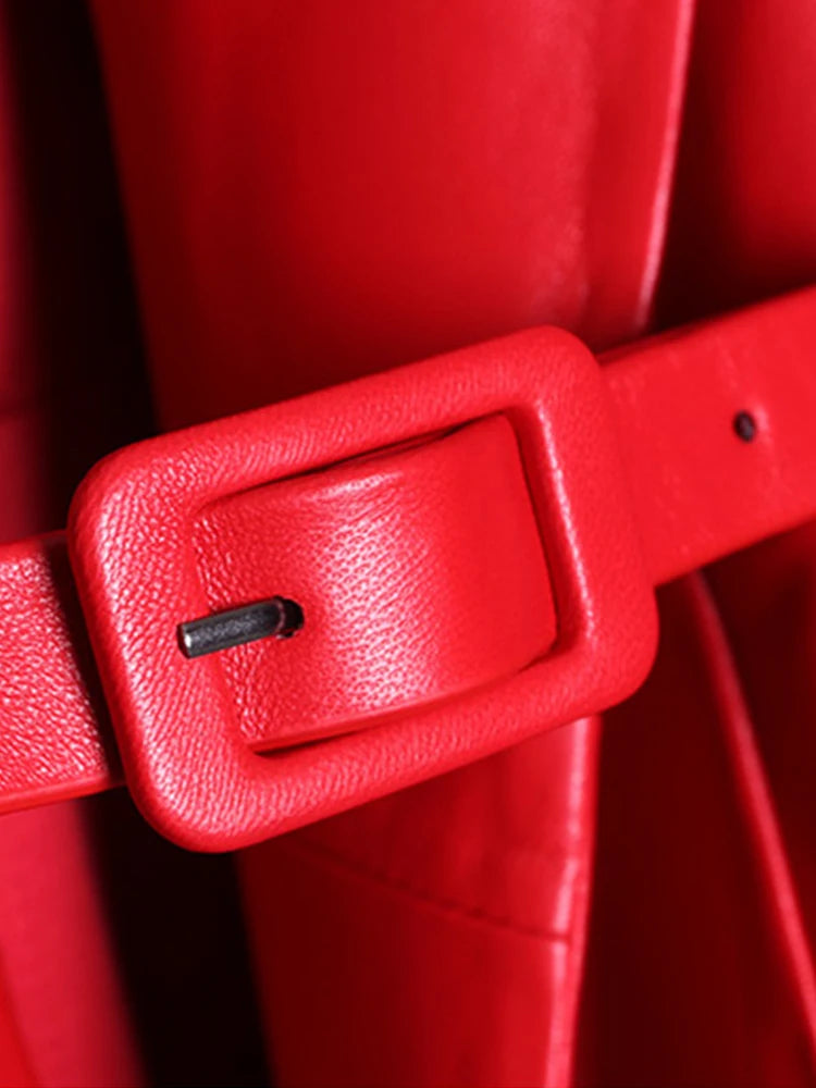 Długi Płaszcz Skórzany Rock Czerwony z Paskiem