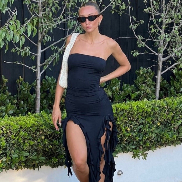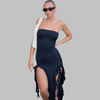 • Sensual Details: The wrap-around bust, strapless neckline, and ruffles add a touch of sensuality and originality to this dress, creating a harmonious balance between seduction and elegance.
