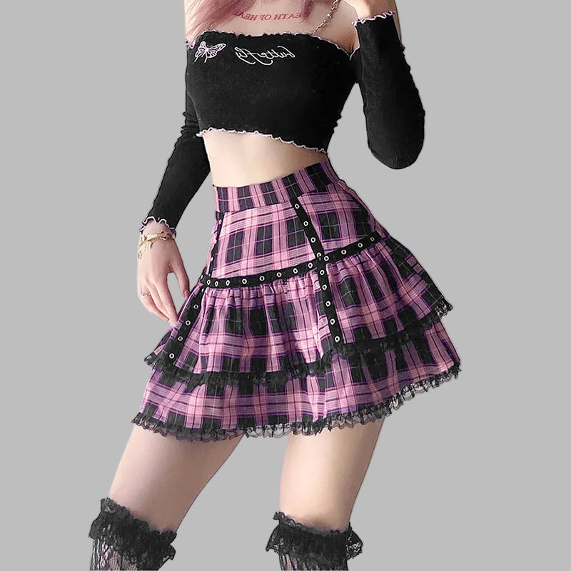 Plaid Punk Rock Grunge Skirt with Lace Trim
