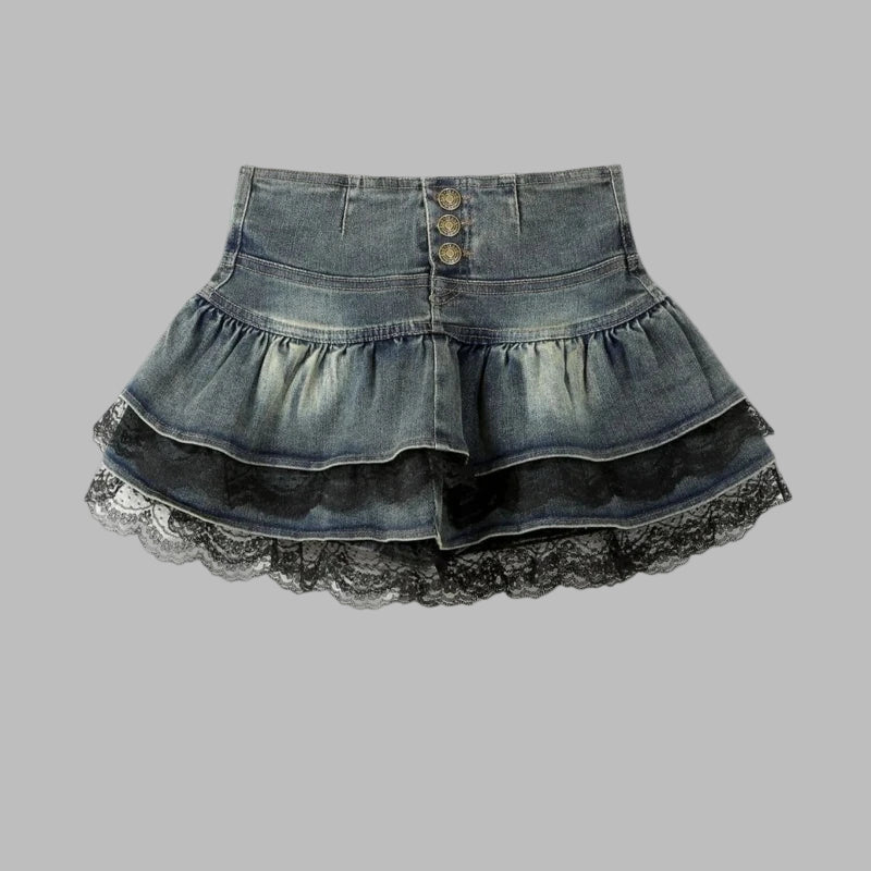Punk Rock Denim Skirt with Ruffles and Black Lace