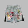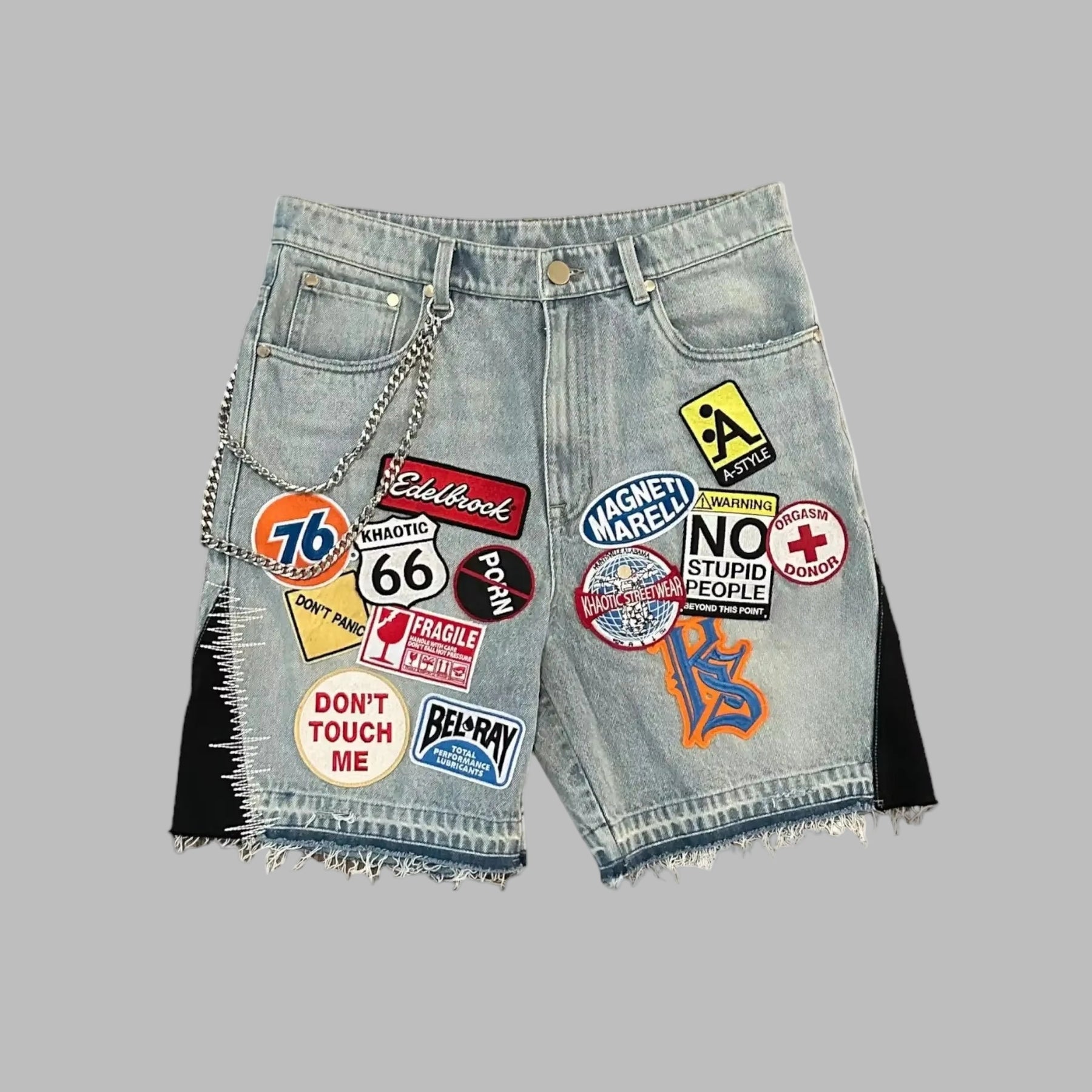Gray Rock Denim Shorts with Colorful Patches and Chain
