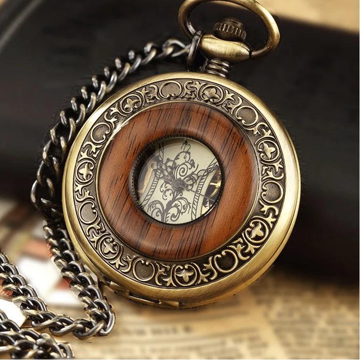 Steampunk Brown Pocket Watch with Wooden Inlay