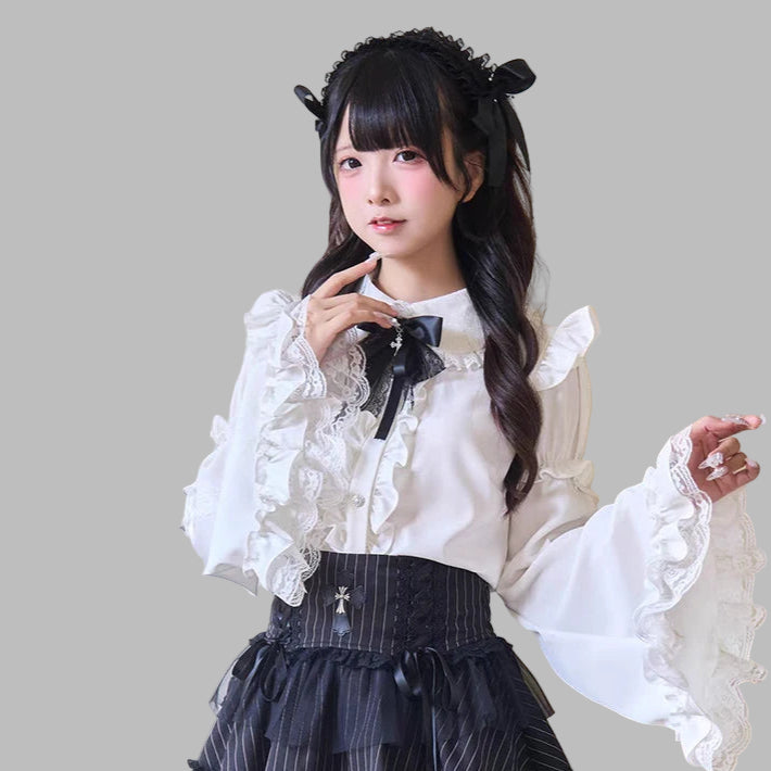 White Gothic Blouse with Black Lace and Bow Jirai Kei Lolita