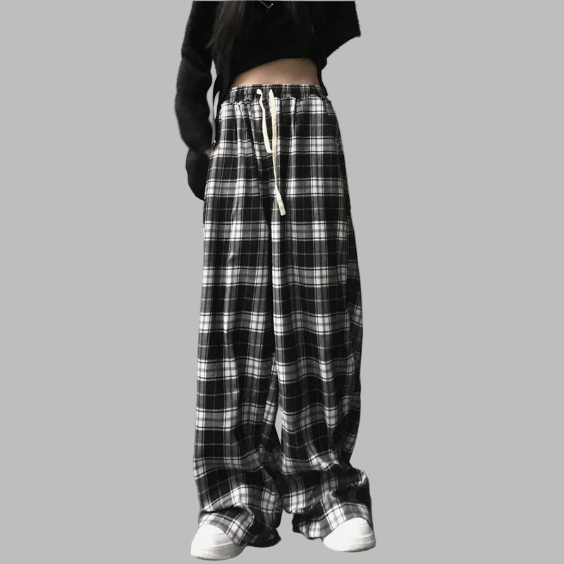 Women's Black and White Plaid Wide-Leg Grunge Punk Pants