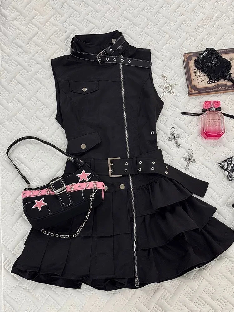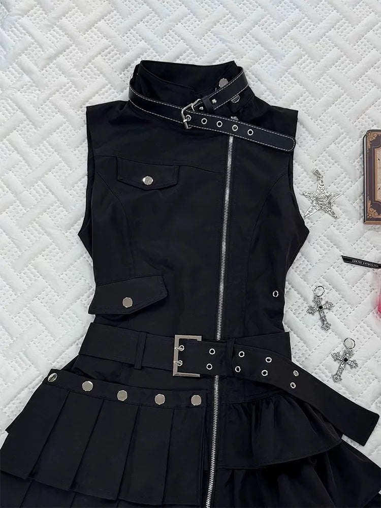 Women's Black Gothic Dress with Stripes, Zipper, and Ruffles