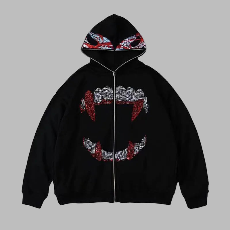 Women's Black Gothic Zip Hoodie with Vampire Fangs