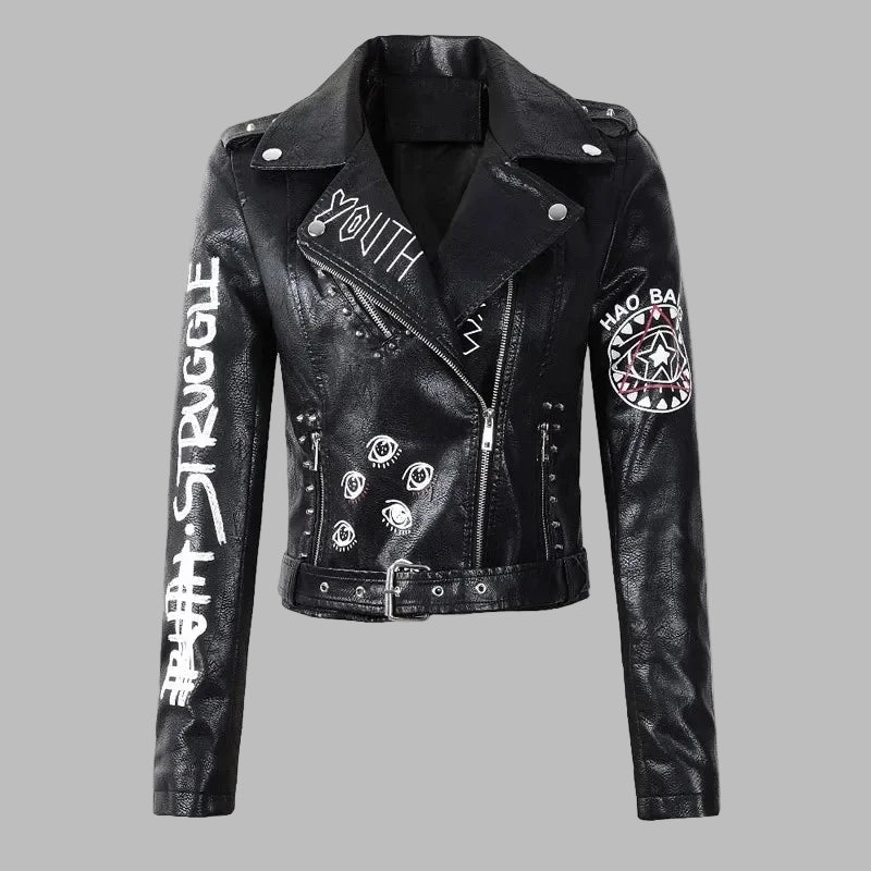 Women's Black Leather Punk Goth Jacket with Studs and Grunge Print