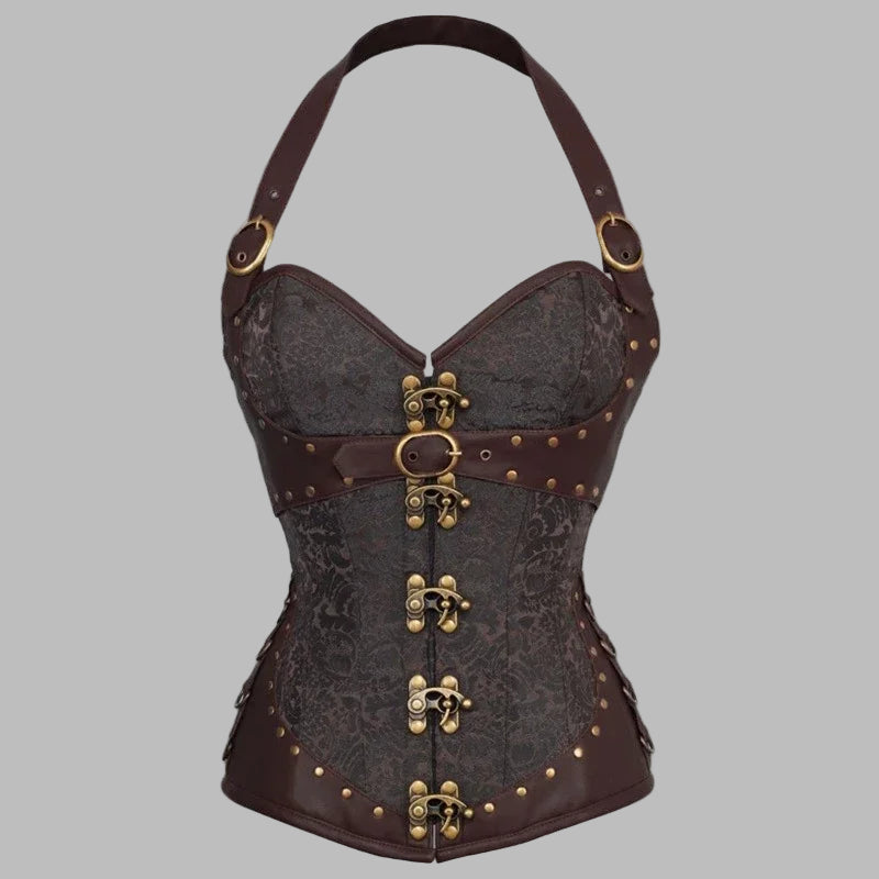 Women's Brown Steampunk Corset with Glitter Pattern and Metal Buckles