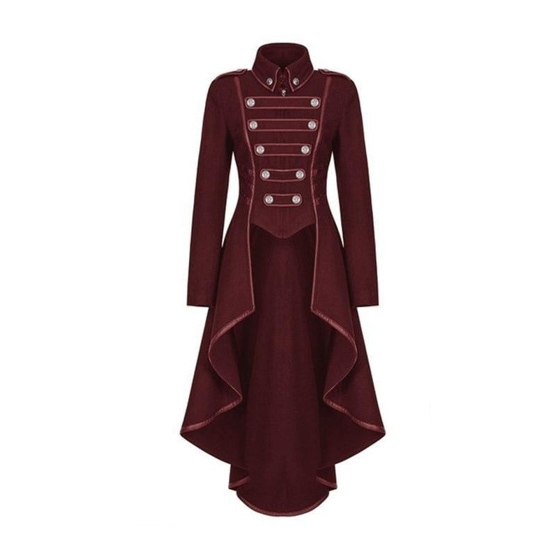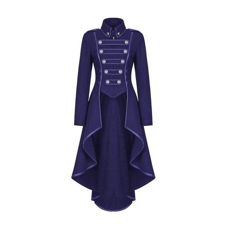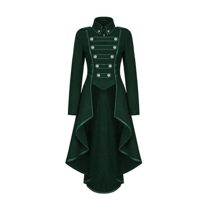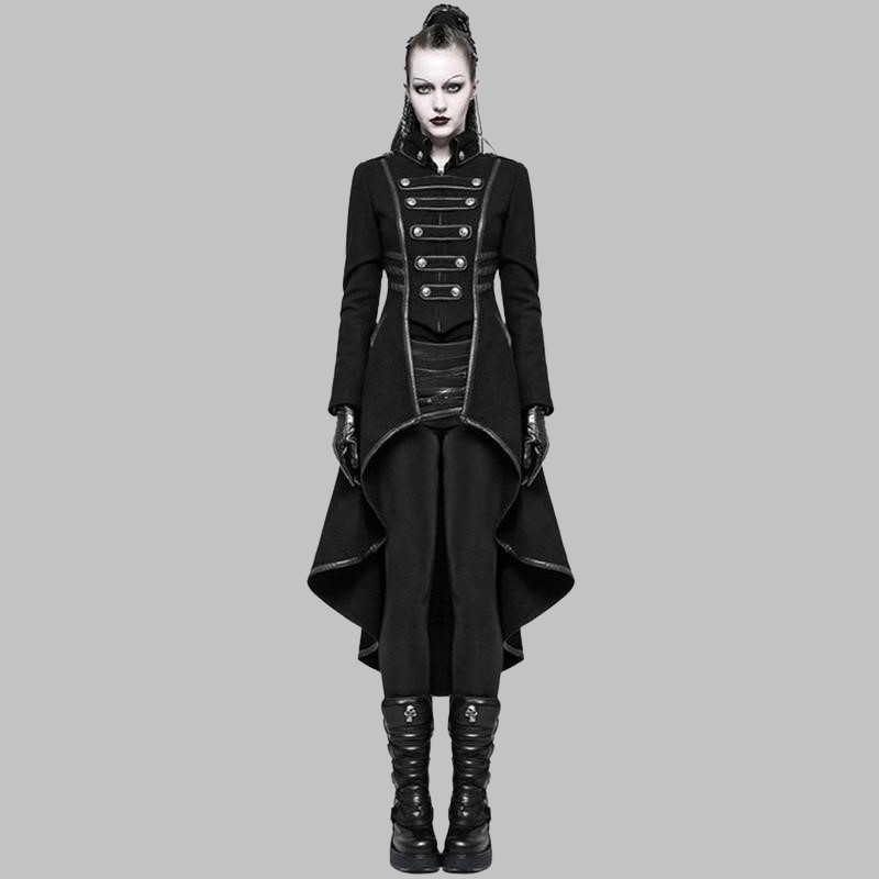 Discover a long-cut gothic jacket for women. The back of the jacket features a tailcoat cut.