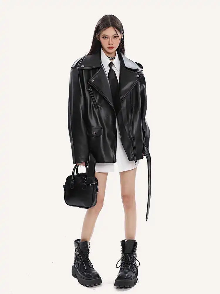 Women's Vintage Long Black Gothic Oversize Leather Jacket View options