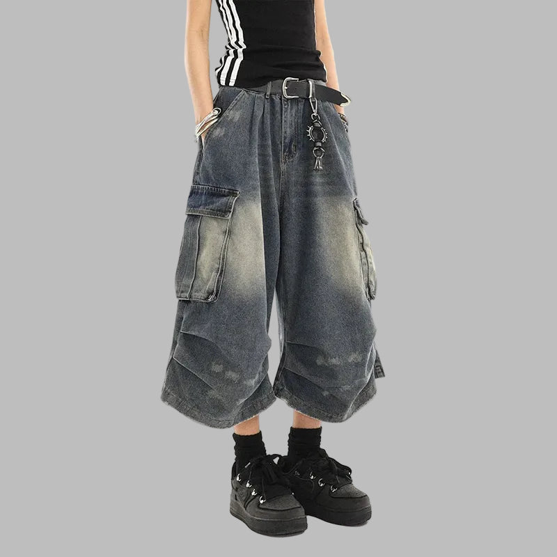 Women's Wide Leg Grunge Denim Cargo Shorts